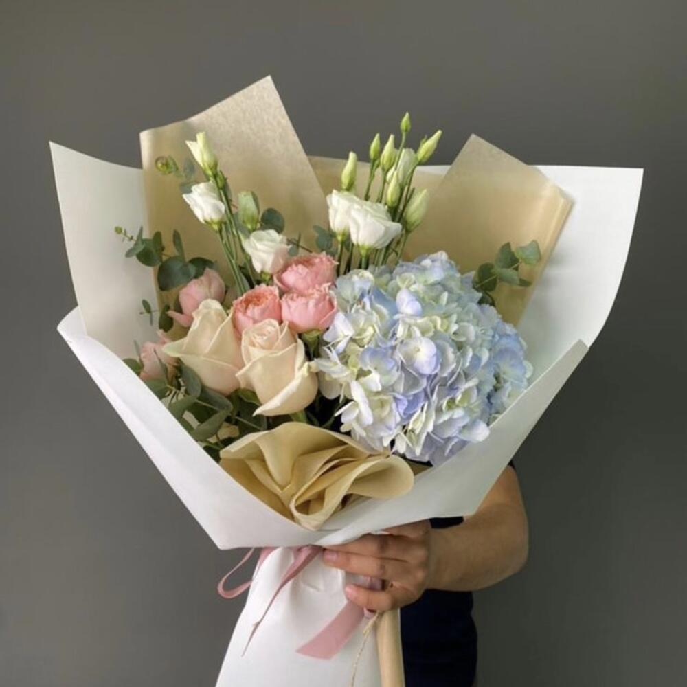 Гортензия - 1 шт. Роза - 1 шт. Кустовая роза - 1 шт. Эустома - 2 шт.